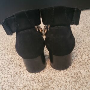 Beautiful black suede Naturalizer sandals. These sandals are gorgeous and ridiculously comfortable. A few scuffs as seen in photo. 1 1/2 chunky heel and perfect to dress up any outfit a little.