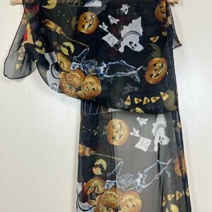 Dainty vintage sheer black Halloween scarf with Halloween pattern (includes pumpkins, ghosts, Frankenstein, skeletons, bats, Dracula, and more). This items does have some snags throughout and some fraying but overall the condition is good with some flaws. There is no branding on this scarf.