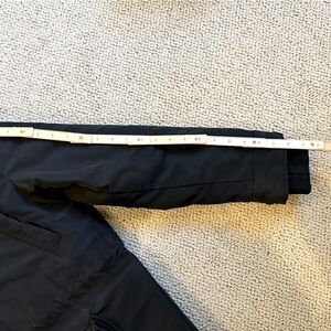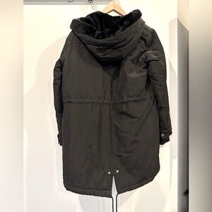 New with tags. 34” legnth, 23” width, sleeves 23” (see photos). Double zipper and flap that snaps over the zipper. Fur lining inside hood and chest area. Hood is not removable, but has a drawstring around it and snaps that adjust the coverage.
