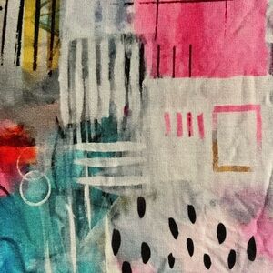 Gorgeous hooded short sleeve sweater by Dolcezza Simply Art. Amazing abstract pattern with hot pinks, turquoise, mustard and black accents.