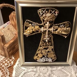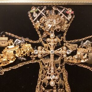 This hand made cross is an absolute stunning use of Noah’s ark jewelry. Jewelry sits upon a raised cross platform covered in black velvet and accent ed by gold tone chain around the outside edge. The center of the cross is adorned by a pearl and gold cross that is surrounded by many different styles of beautiful Noah Ark jewelry. Tiny angels and cherubs are scattered. Elephants, lions and giraffes - two by two scattered across the picture. Place on mantle or Perfect for a child’s room or babies nursery. Would be a great baby shower gift or new parents gift. Would even look wonderful in the church nursery. Great gift for a church friend. There will not be another one like it I assure you!