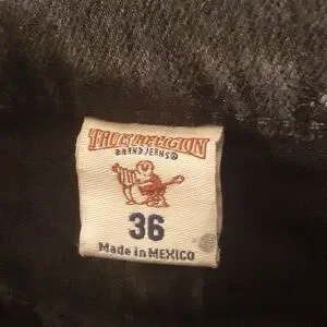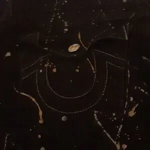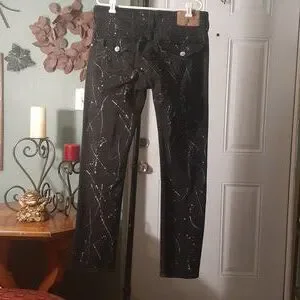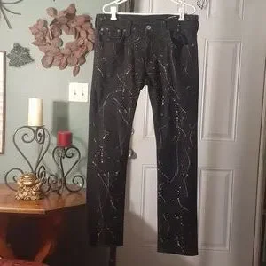 True Religion men's splattered skinny jeans size 36 98% cotton 2% elastic color black, gray, gold 19in across waist 33in inseam 22in to 24in across hips 43.5in length