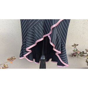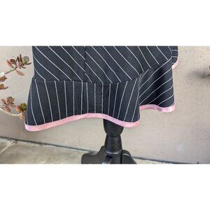 This vintage-inspired halter dress features a stylish pinstripe pattern, adorned with pink satin trimming and a rose accent for a touch of elegance. The stretchy fabric makes it comfortable while still offering a form-fitting silhouette. Ideal for themed events like mobster moll, doll, or speakeasy parties. Pair it with a feather boa or pearls for a complete look!