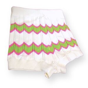 Ivory Swirl Kiss Crocheted Sweater Shorts With A High Waist. White Crochet With Eyelet Lace Detail, Green And Hot Pink Zig Zag Stripes. Elastic Waist With A Drawstring. Excellent New Condition, NWT, No Flaws!