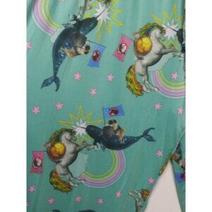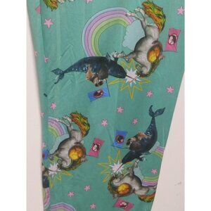 Overall Mint/light blue color with a fun/novelty print of Dog, Whale, Unicorn, Cats and Rainbows/ - Prince of unicorns pugs wells rainbows. Has a Stretchy waist with a drawstring and button closure.