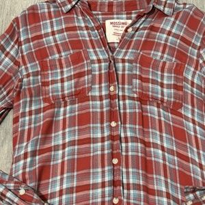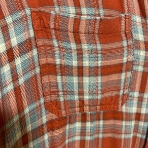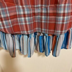 LIKE NEW - WORN TWICE IN EXCELLENT CONDITON! Amazing women's Upcycled Gypsy (from Etsy) super soft flannel shirt with custom chiffon ruffle on hemline. Can be worn as a jacket shirt or a dress - so cute on. Super lightweight, soft, boyfriend style loose fit. Two pockets in front, button down front. Long sleeves. Colors are red, turquoise and white - has a wonderful distressed look to it - also could be worn as a dress if petite in height. Shirt before artist created this piece is Mossimo. SIZE - MEDIUM