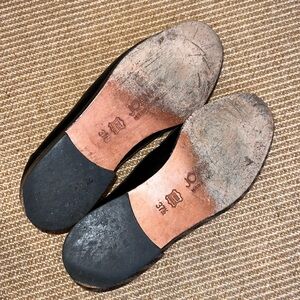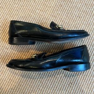 Classic black leather loafers handmade in Italy. Gold tone horsebit hardware, leather lined innersole, and leather soles. Good preowned condition, some natural creasing on front of shoe, and could use new heels.