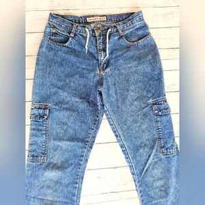 Perfect for so many different looks and styles from boho, western to hippie or emo. Comfortable Blue Denim Cargo Jeans bottoms pants. Side leg Cargo pockets and tie string at waist. Size tag is missing but I believe these to be a 5/7 based on Measurements.