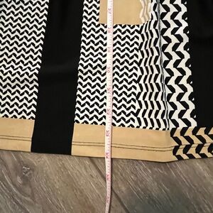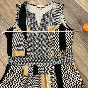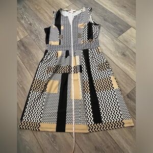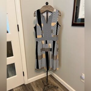 This is one of my favorite Jude Connally dresses! It is a patterned neutral colored print, fitted dress! V- neckline. Sleeveless. Has pockets!!! These is some fabric pulling under left armhole- see last pic. Otherwise, good condition! Wish this one still fit!