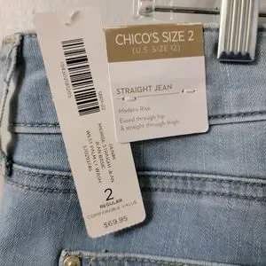 Chicos midrise straight Jean west palm light wash. Brand new with tags. These are eased through the hip and straight through the thigh. Size 2 = US 12.