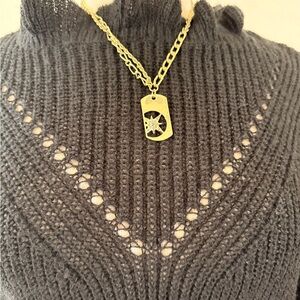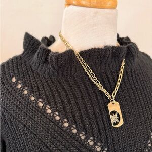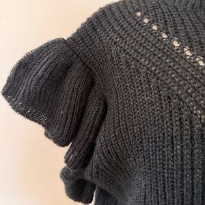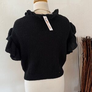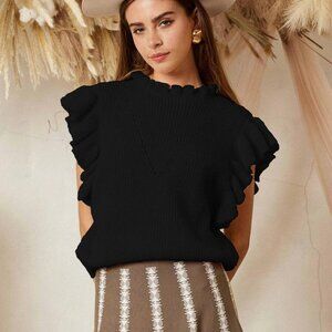 Chic with just the right touch of romance ✨ This black knit top is crafted from 100% polyester, offering breathable comfort with a soft, cozy feel. Designed with a delicate ruffled mock neckline and flutter ruffle sleeves, it features a subtle open-knit V detail across the chest that adds texture and visual interest without being sheer-heavy.