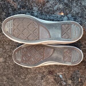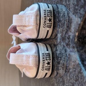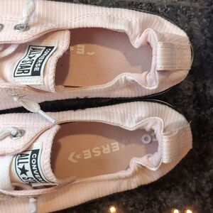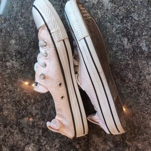Converse low profile slip ons. pink with a white pin stripe. gently used. minor scuff marks around the soles