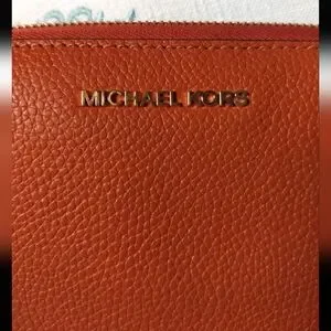 Fall is in the air with this pumpkin spice burnt orange Michael Michael Kors Large Jet Set Wristlet. Perfect for the Fall festival, Halloween, crispy weather vibe. Complete with a convenient wristlet strap, the Jet Set continental wallet keeps your essentials within reach. This crossgrain leather piece showcases an elongated shape with pale gold-tone accents and a zip closure. Perfect for holding smart phones and all the necessities.