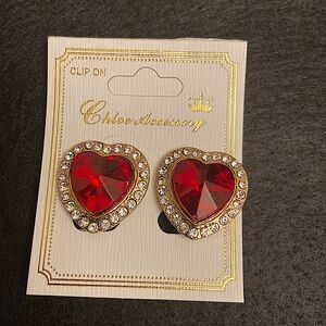 Chloe Accessory Heart Shaped Red and Rhinestones Clip On Earrings.