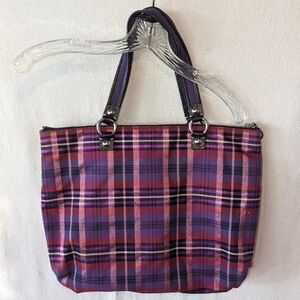 Women's Purple Plaid Coach Poppy Tartan Shoulder Bag No. F1082-15886. This bag is a stylish and trendy accessory that combines Coach's signature quality with a fun and vibrant design. This bag is perfect for adding a pop of color and pattern to your outfit while providing practical storage space. It comes with 4 coach bag tags, and all zippers work. There are no rips tears or stains. I do have more pictures of the bag available if you would like them.