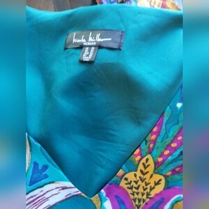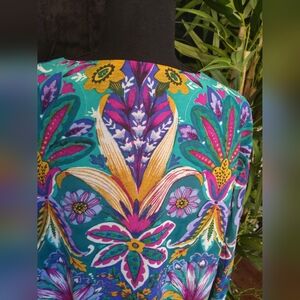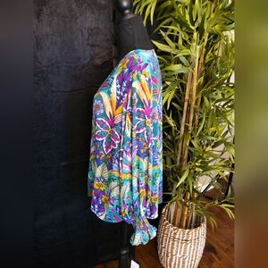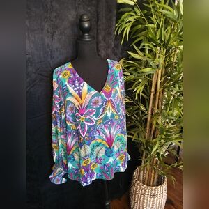 Beautiful ladies long-sleeve floral top, bright and colorful ruffle at cuff of sleeves. It is lined except for the sleeves which are sheer. This top is stunning and a must have for your wardrobe. It is new with tags.