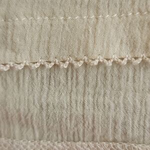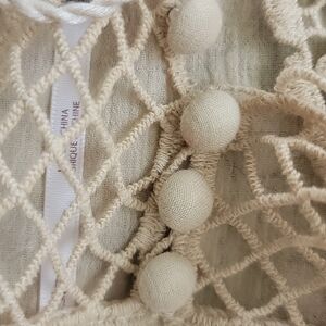 Woven cotton top Mockneck Crochet panel at shoulders Tonal top stitching and panel seaming Lace up closure