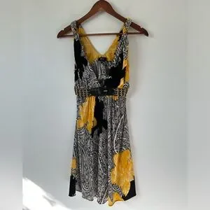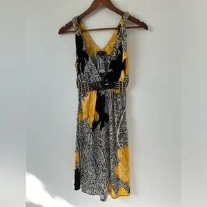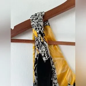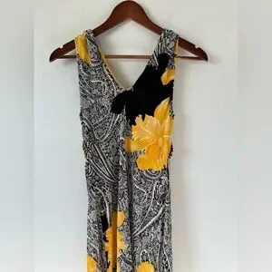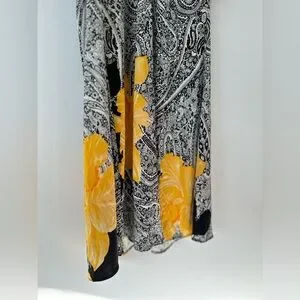 Stunning and vibrant silk dress features a unique paisley pattern in classic black and white, beautifully contrasted with bold yellow floral accents.