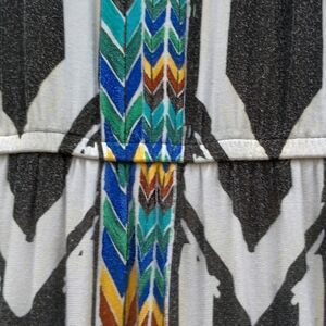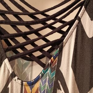 Very nice dress in excellent condition. Scoop neck in front, deeper scoop with black criss cross in the back. 21" slits up each side. Essentially sleeveless with full coverage under the split sleeves (no side boob).