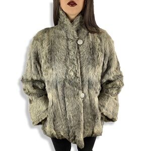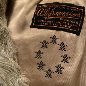 1950’s natural gray curly goat fur short swing coat w/wide belled sleeves by A. LAFRANCE & SONS FURRIERS. Excellent condition + tailored to perfection. Collar can be popped up or down. Wide belled cuffed sleeves. A-line swing coat w/extra added fur along the back. 2 gray leather buttons. 2 pockets. Inside is lined in satin with hidden inside pocket. No marked size, best fits a small-medium. Laying flat, measures 17.5” across shoulders, 23” across underarms, 22” sleeves, 26.5” down the back