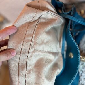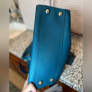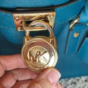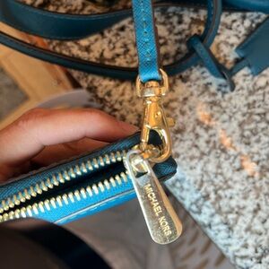 The bag and wallet are in very good condition. The handles, strap, corners, and the inside are all clean with exception of two tiny pin spots on the inside bottom of the bag. I posted a picture of the fabric. There is some wear on the hardware underneath the lock and a little bit of wear on the lock, it is missing the key. I posted a picture of that as well. The wallet has the slightest wear on the Michael Kors name. It’s a gorgeous teal blue green set! The set is discontinued, my loss is your gain! Please let me know if you have any questions and I will accept reasonable offers. Have a great day.☀️