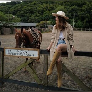 Grace Gift X Samantha Lin Leather V-Cut Western Block Heel Long Boots Beige 23.5