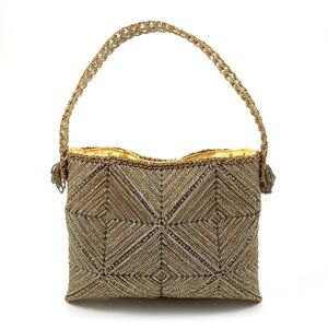 Rare 1950’s Japanese crafted silver and gold metallic crotchet geometric purse by MAGID. Excellent condition! Made in Japan. Super thin silver and gold metal chain-like thick fabric crocheted together in a beautiful geometric pattern. Glass beading on the sides on the strap. Snap closure on top. Beautiful clean peach satin lining inside with a full zipper pocket and additional pocket. Light weight. Measures 8” wide, 6 1/4” tall, 1” deep. Strap drop is 5 1/4”.