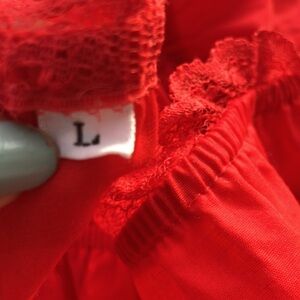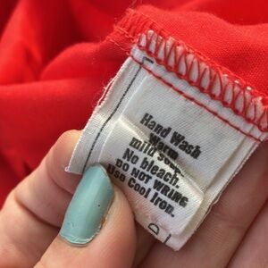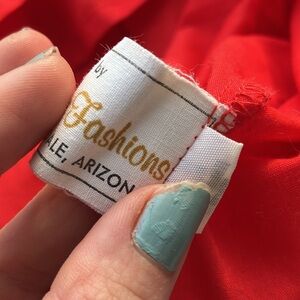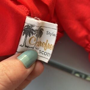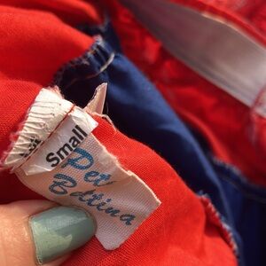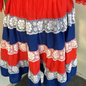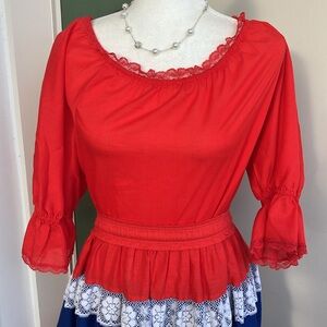 Vintage 1970s Pete Bettina red peasant top and Carefree Fashions of Scottsdale, Arizona skirt in red, white, and blue. Elastic around the collar of the neck has been stretched out but is still a wearable shape. Elastic around cuffs of sleeves is still good. Lace on the ends of the sleeves. Elastic around the waist of the skirt is mostly out, not crackling but does not stretch as much as it probably should. Tag on top says size L. Tag on skirt says size S. Would best fit a M/L. Measurements taken lying flat.