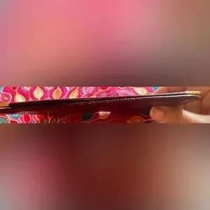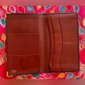 Beautiful Cartier Bordeaux burgundy leather with real gold hardware. Measures approximately 7 x 4“. Excellent used condition. Rare pebble leather outside and smooth leather inside.