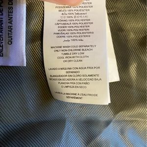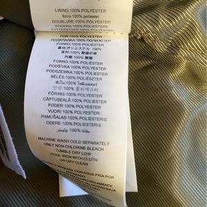 I received this as a present, and it has hung in my closet. I’ve never had the chance to wear it. It is lightly lined and has a removable hood. I don’t think it’s waterproof, but it may be water resistant.