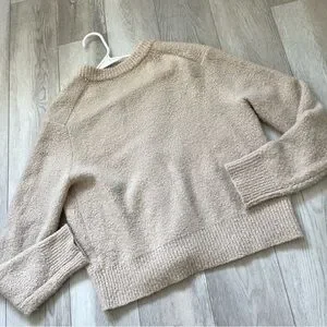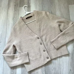 Jenni Kayne Merino Wool Boucle Boyfriend Cardigan Sweater in the color Beige. V neckline with button down front. Long sleeve. Slightly cropped. Super soft, slightly thicker boucle material. Relaxed fit. In great pre-worn condition, but one small stain at front as shown in photos. Size small. 93% merino wool, 8% polyamide.