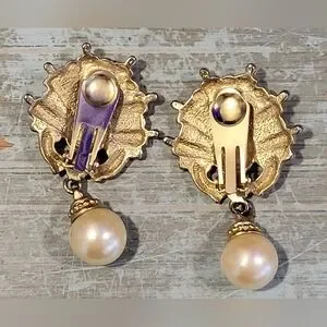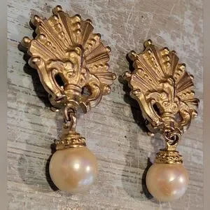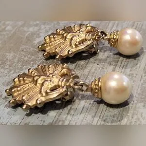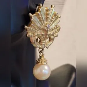 Elevate your style with these vintage clip on goldtone statement earrings with accent pearl! Gorgeous Hollywood Regency Look!!