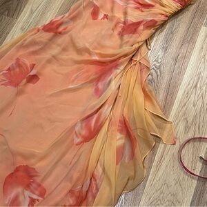 Vintage Laundry by Shelli Segal silk dress in a stunning peach sunset color, perfect for prom, a wedding guest outfit, or an elegant evening look. Made from genuine silk with a watercolor effect, this dress features delicate spaghetti straps, a zipper, and hook closure. A designer couture piece that combines timeless elegance with a unique, artistic flair.
