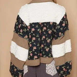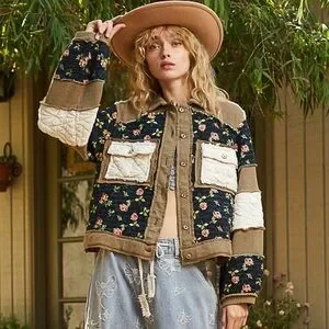 Designed in collared neck long sleeve relaxed fit jacket top in quilting with jacquard patch, front pockets, out seam detail, vintage washing, floral pattern.