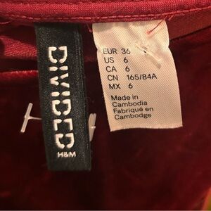 Divided red, velvet like dress, size 6 women’s, 13” pit to pit. 31.5” from top of shoulder to bottom hem. Back features a v-cut. Never worn. My daughter removed the tags.