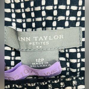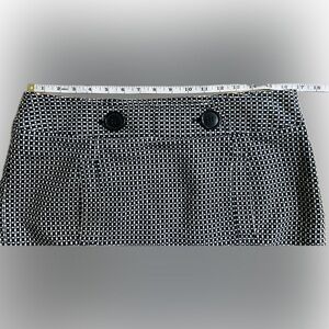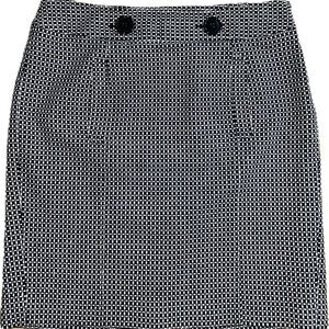 EUC Ann Taylor SZ 12P black/white skirt/2 front pockets/side zip, fully lined/rear split at hemline 7.5”, two oversized non functioning buttons accent the waistband.