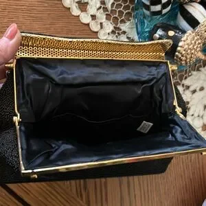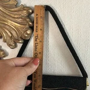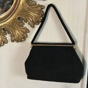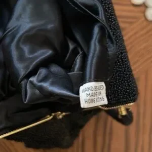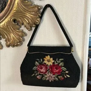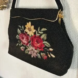 Vintage 1950’s Hand-Beaded Floral Needlepoint Handbag with fully-beaded Strap ~ Made in Hong Kong. Glass beaded bag with a black background and front rose needlepoint design. Brass hardware. Inside lined in black satin fabric with a side pocket. Measurements shown in photos. In excellent preowned vintage condition with no issues. Smoke-free home.