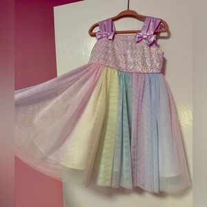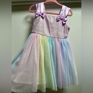 Size 2t. Rainbow pastel colors. The purple is a lavender shade. Beautiful sequence. Three buttons down the back and a mesh tie to finish the look. Perfect for birthdays or up coming holidays!