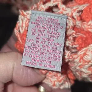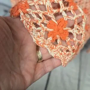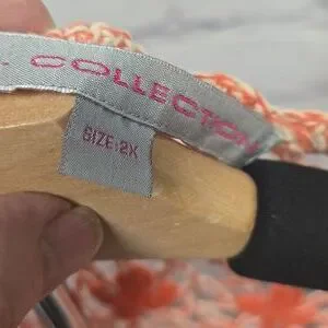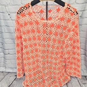 S.A. Collection Crochet Mesh Sweater, 2X. Pre-owned. Colors are orange and white. Mesh type sweater with a floral design and a scallop edge around the neck and cuffs. Long sleeves. No apparent flaws, stains, rips, or tears were found. Smoke-free home. Shipping is usually within one day.