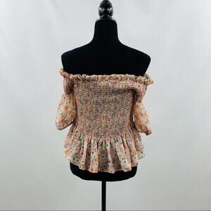 Socialite Ruched Peplum Waist Floral Off the Shoulder Blouse. Short bubble sleeves.