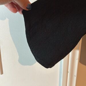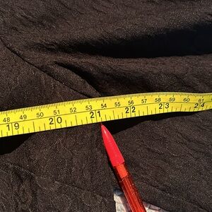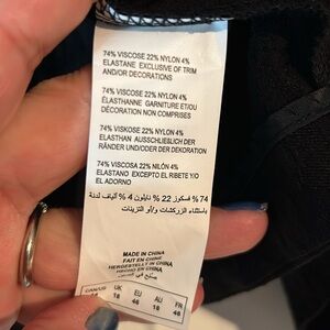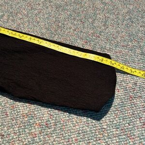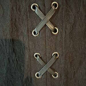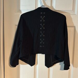 This is a beautiful black size 14 bolero style jacket by Michel studio. There is stretch in the fabric. There are darts in the bust area. It’s a high low front with it coming to a point. The sleeves have a slight rounding to them. The back is absolutely eye-catching with it too look like it’s being held together with leather straps in the shape of and “X”. An absolutely gorgeous and very versatile piece perfect to have in any closet.
