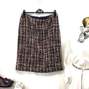 Excellent Condition Talbots Tweed Boucle’ tailored lined, back zip back kick pleat grosgrain fitted waistband double darts in back, Black brown cream gold and metallic plaid pattern skirt.