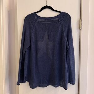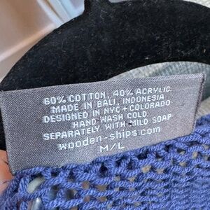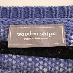 Wooden Ships navy blue with white star sweater. Cotton and Polyester mix, so it holds it shape. No visible stains rips or tears. Size M/L. Loose Weave and slouchy. very comfortable sweater.