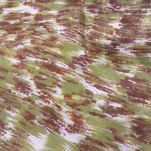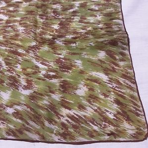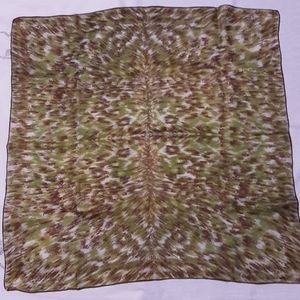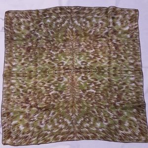 Kitschy vintage scarf from the 1940's - 50's with cheetah print in shades of olive green and brown. Feels like rayon, maybe blended with acetate, material is smooth and light. No listed brand. Large square.