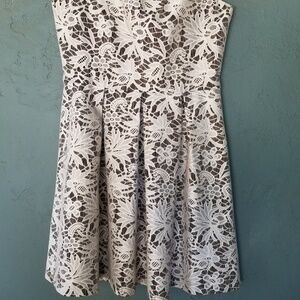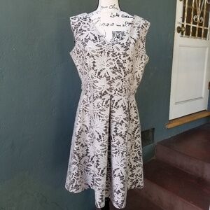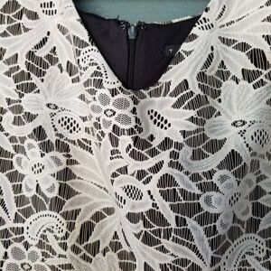 Elegant fit and flair dress that's fully lined with a back hidden zipper. The white lace has a slight sheen over the black lining and it's perfect for any special event from a party to a wedding. In excellent condition, it's ready for you to wear!