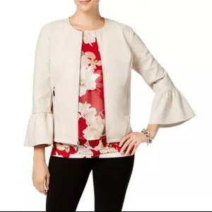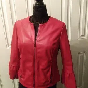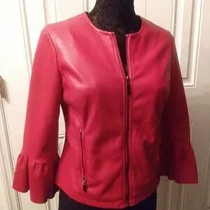 Red Faux Leather Pleather Jacket Collarless Ruffle Sleeve Alfani Petite Medium