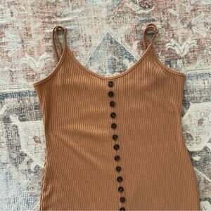 Chic ribbed midi dress with button front styling, front slit, and adjustable straps. Great basic staple with lots of stretch. In good condition.