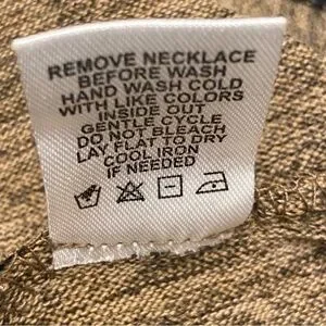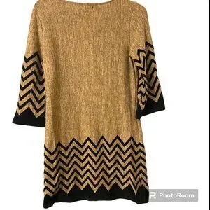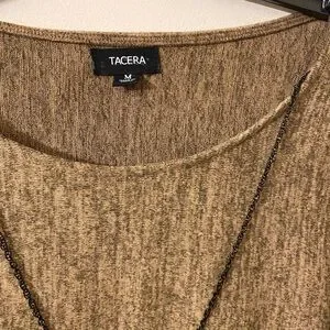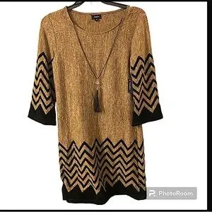 TACERA New with Tag Women’s Brown Taupe Pullover Long Sleeves Attached Faux Leather Fringe Detachable 23” inches Necklace Dress Medium. Decorative chevron pattern near edges of sleeves and below the waist. Heather brown taupe fabric, 88% polyester material. Round neck, long sleeves. In good condition.