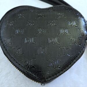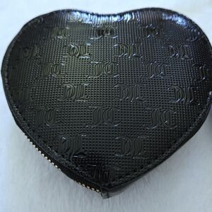 Heart❤️ shaped, faux patent leather with debossed "JC" and dots; lining is white with repeating black🖤 "Juicy Couture"