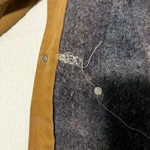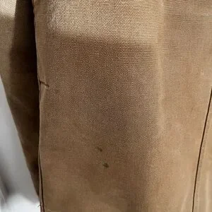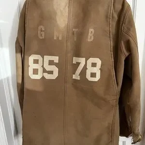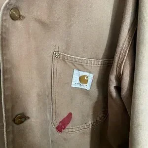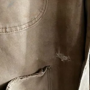 Carhartt jacket, lined and hooded. Corduroy collar. Has some stains and small holes. Also has some numbers printed on the back. Tag is faded, but I believe it’s an XL. See photos for measurements and condition.